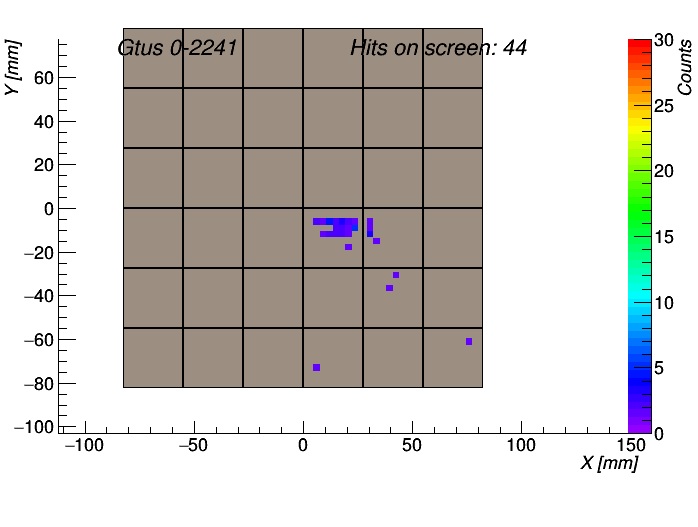 Figura 1: Distributia fotonilor unui nuclearit pe planul focal al telescopului Mini-EUSO (masa nuclearitului simulat 20 g, viteza 100 km/s, durata evenimentului. 2 s, altitudinea 15 km).